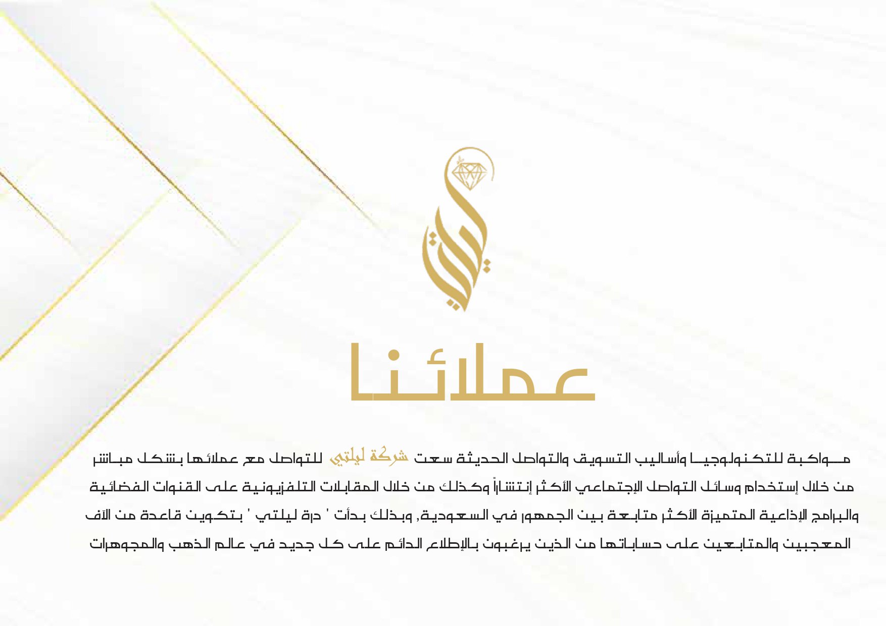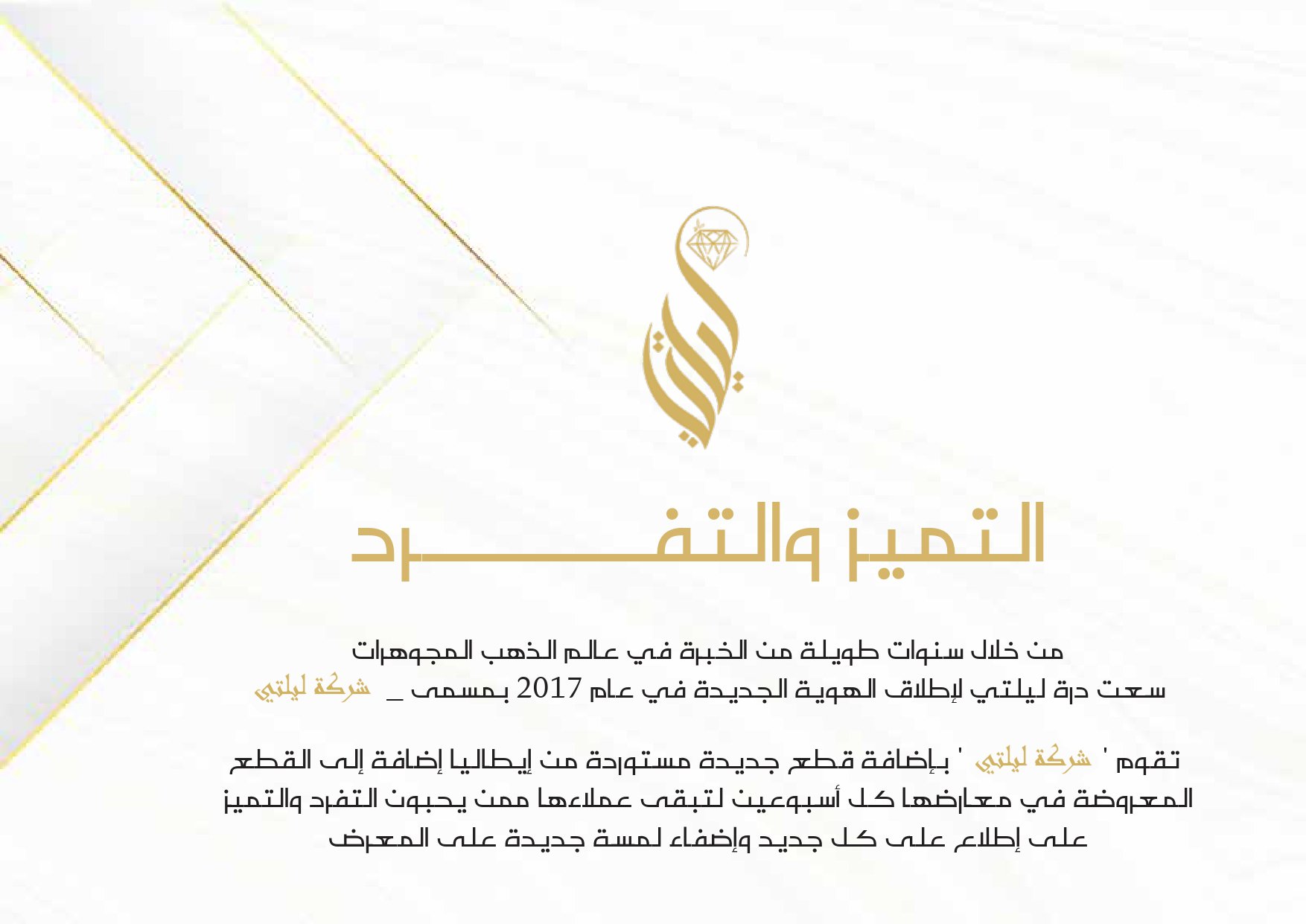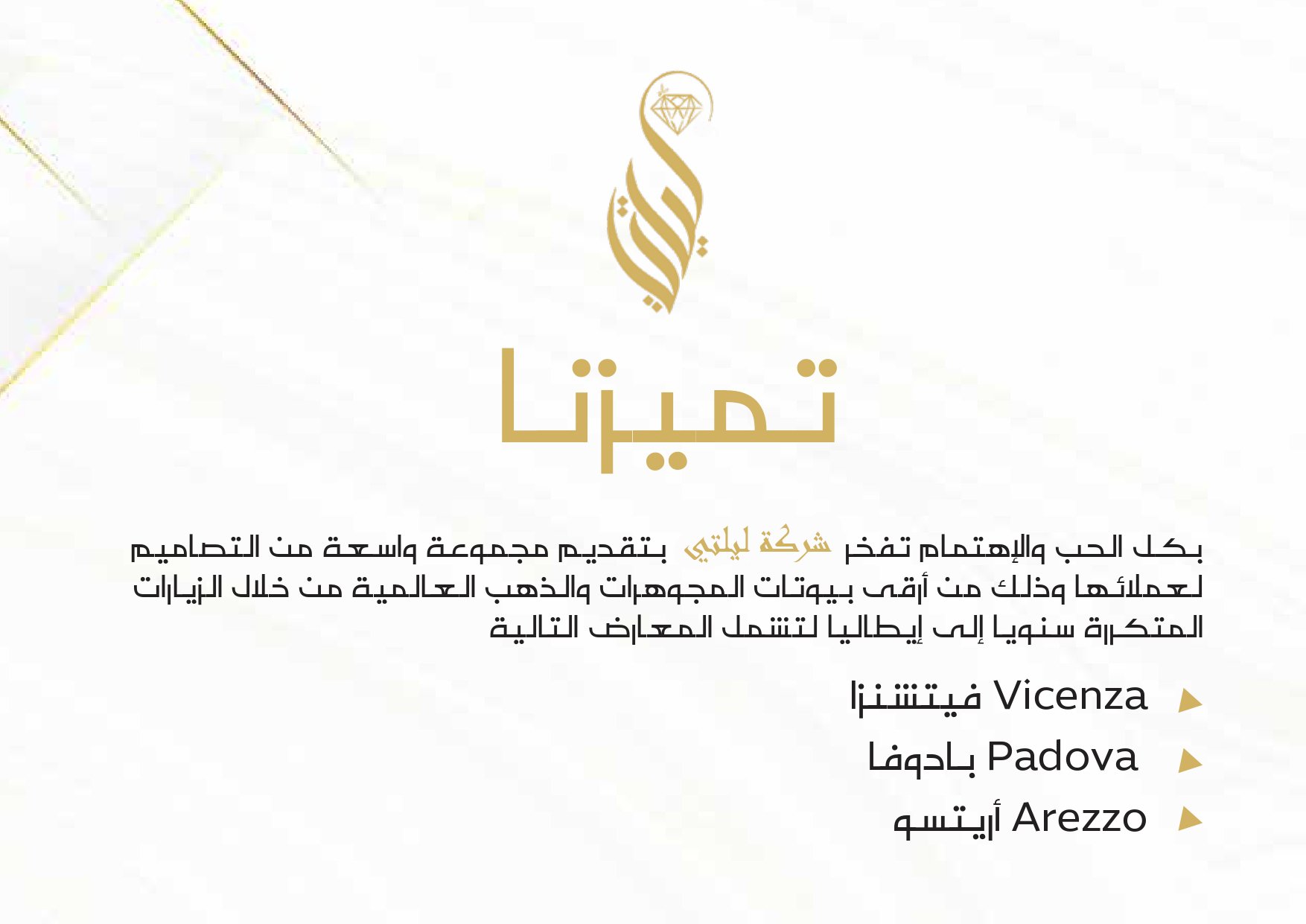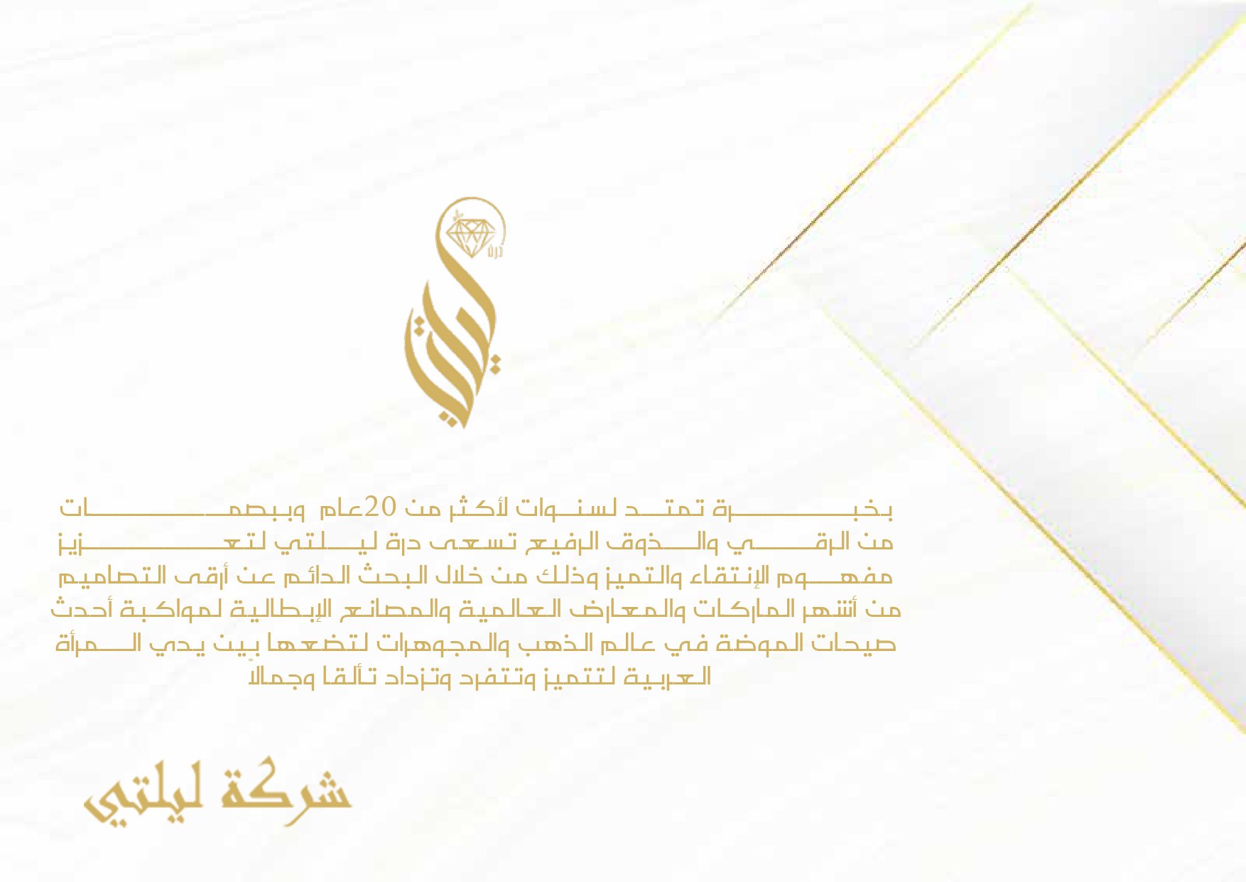 - شركة ليلتي للذهب والمجوهرات علامة تجارية سعودية مسجلة ، السباقة في توفير أحدث وأجدد الموديلات الإيطالية المتقنة تصميماً وجودة .
